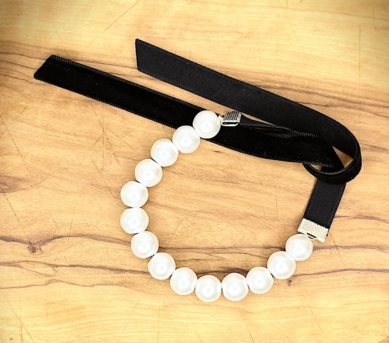 Pärlarmband med vita plast pärlor och svart sammetsband som knyts på valfritt sätt.